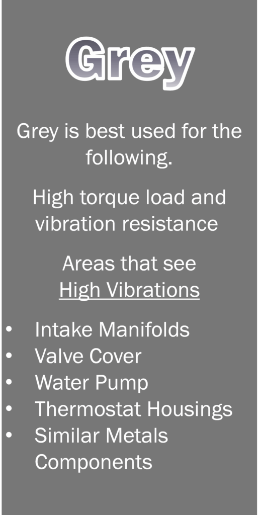Our Optimum line is our Latest and Greatest Formula Line. It provides the best aspects of our products, based on their color’s purpose. It is thin enough to use a tube, this requires the parts be hand tightened together, wait an hour for the proper adhesion and the cure to start, then torque to specification. Blow out protection occurs around 8 hours and full cure is at 24 hours. Great for Fleet Vehicles that get taken apart frequently.