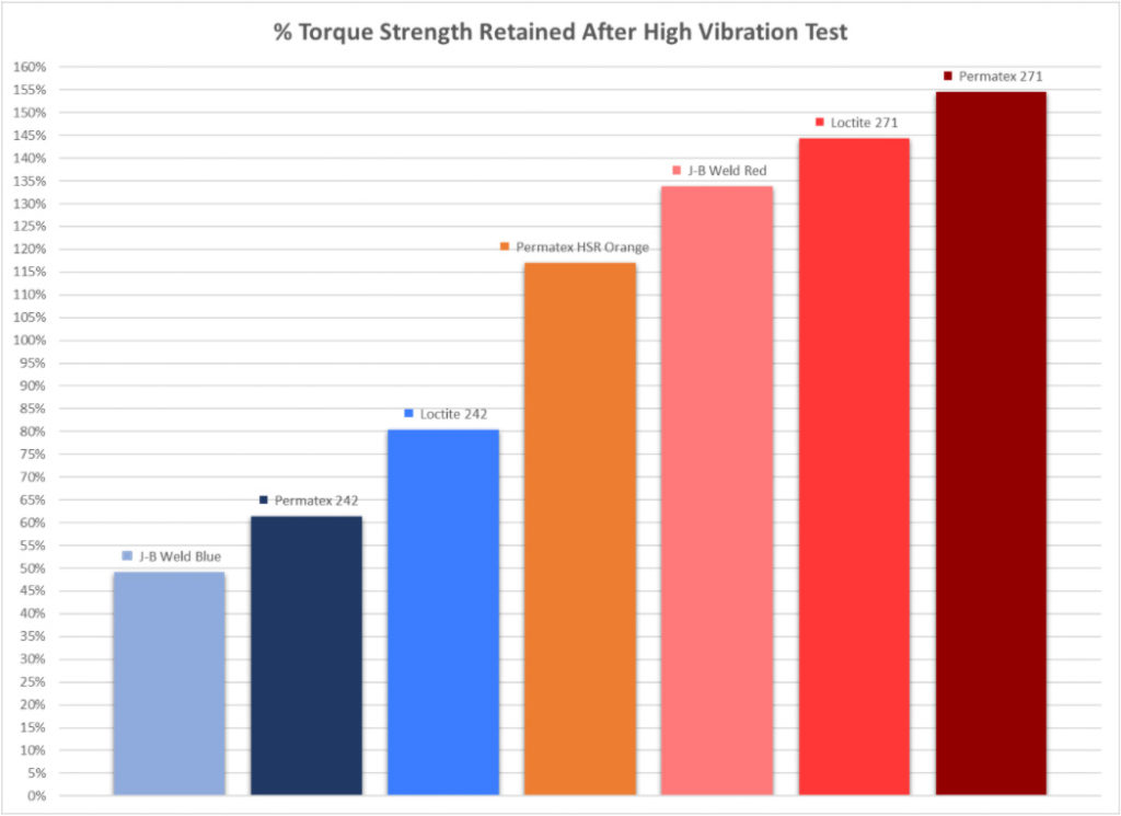 The High Vibration Study tests the torque strength retained from Blue, Orange and Red Threadlockers. Orange Threadlocker surpassed 100% torque strength similar to a Red Threadlocker, making it the ideal hybrid solution.